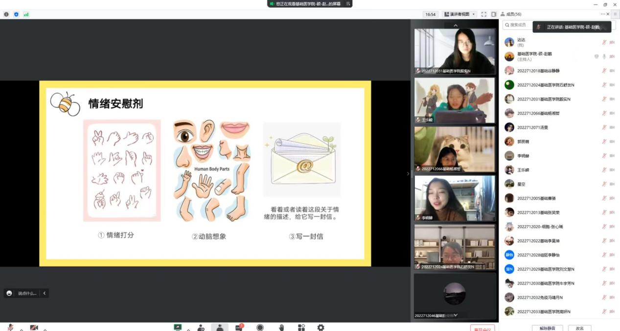 为了全面贯彻党的教育方针、推进素质教育,加强和改进大学生心理健康,提高大学生心理调节能力,培养良好心理品质,促进大学生思想道德素质和心理健康成长,更有利于大学生的科学文化素质和身心健康素质的协调发展。基础医欧洲杯学生朋辈心理辅导员于10月17日通过线上腾讯会议的方式,在2022级研究生班级中组织开展新生团体心理辅导活动。