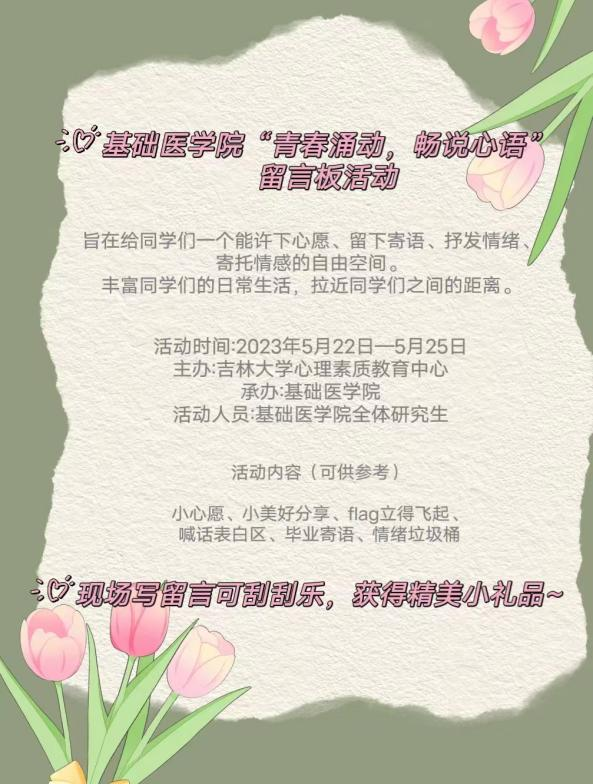 于2023年5月22日开展“青春涌动,畅说心语”留言板活动,本次活动由研究生辅导员孙佳钰老师指导,学生心理朋辈辅导员赵鹤组织策划。活动采用线下留言墙的形式,以自由、开放、即时、交流为特点,旨在给同学们一个能许下心愿、留下寄语、抒发情绪、寄托情感的自由空间。丰富同学们的日常生活,拉近同学们之间的距离。