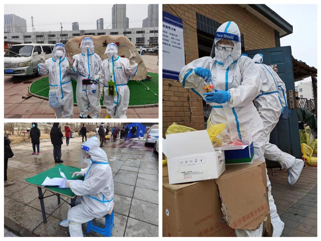 在2022年3月11日封校第一天,支部的张海英老师就向所在社区申请做志愿者工作,直到4月28日长春解封,她一直在为小区居民采集核酸。在她的志愿者日记中写道:“2022.4.3今天协同梅河口支援的朋友们入户采核酸。他们早上五点多穿上防护服,就没有吃过喝过,没有上厕所。我除了感动,还有心疼!特殊时期,请大家握紧援助之手,齐心协力,快快走出沼泽!”