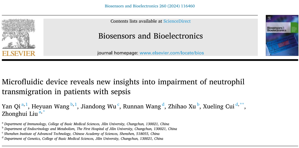 免疫学系柳忠辉教授团队于2024年6月1日在国际高影响力刊物《BIOSENSORS & BIOELECTRONICS》上发表了题为“Microfluidic device reveals new insights into impairment of neutrophil transmigration in patients with sepsis”的学术论文。该期刊是生物物理学领域的国际顶尖学术期刊之一,中科院分区为1区,影响因子为10.7。《BIOSENSORS & BIOELECTRONICS》杂志在生物物理学领域和分析化学和电化学领域所有期刊中分别排名第2和第3位,具有很高的学科影响力。齐妍副教授为第一作者、柳忠辉教授及崔雪玲教授共同通讯作者,欧洲杯