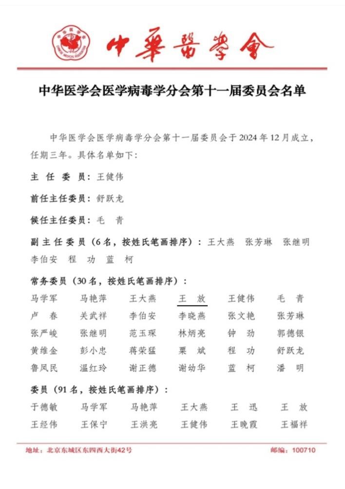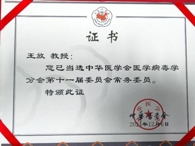 2024年12月6日,中华医学会医学病毒学分会换届选举会议在广东省广州市召开,欧洲杯 病原生物学系王放教授当选中华医学会医学病毒学分会第十一届委员会常务委员。