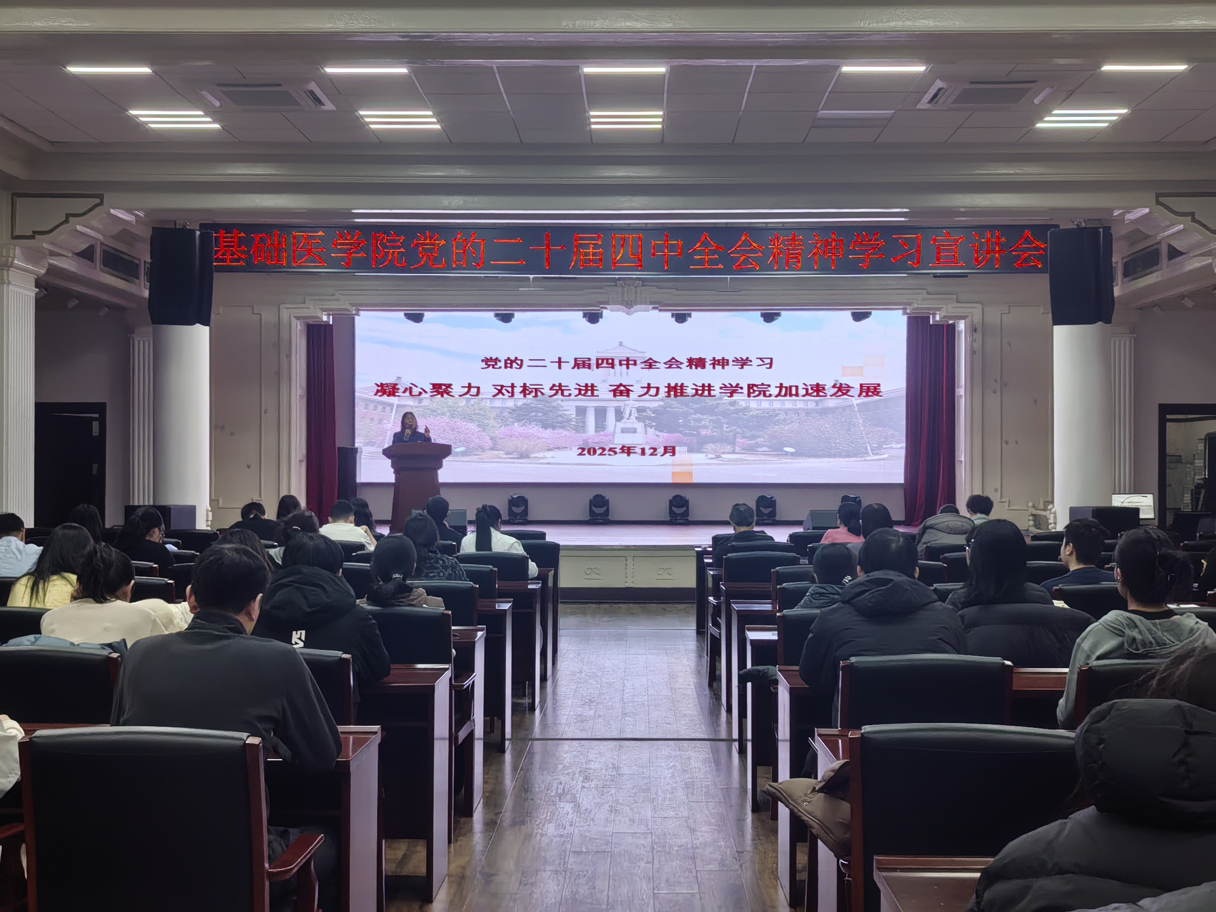 王晓荣书记以领学形式,分四个部分深入解读党的二十届四中全会主要内容。领学过程中,她重点以“十五五”时期在基本实现社会主义现代化进程中的重要地位展开解读,深入阐释了“十五五”时期经济社会发展的指导方针、战略任务与重大举措,讲解了坚持和加强党的全面领导、凝聚推进中国式现代化磅礴力量等核心要求。王书记向全体党员传达了学校“十五五”期间的发展目标、核心使命、主要任务及战略思路。她号召,欧洲杯全体党员要以党的二十届四中全会精神为指引,锚定欧洲杯