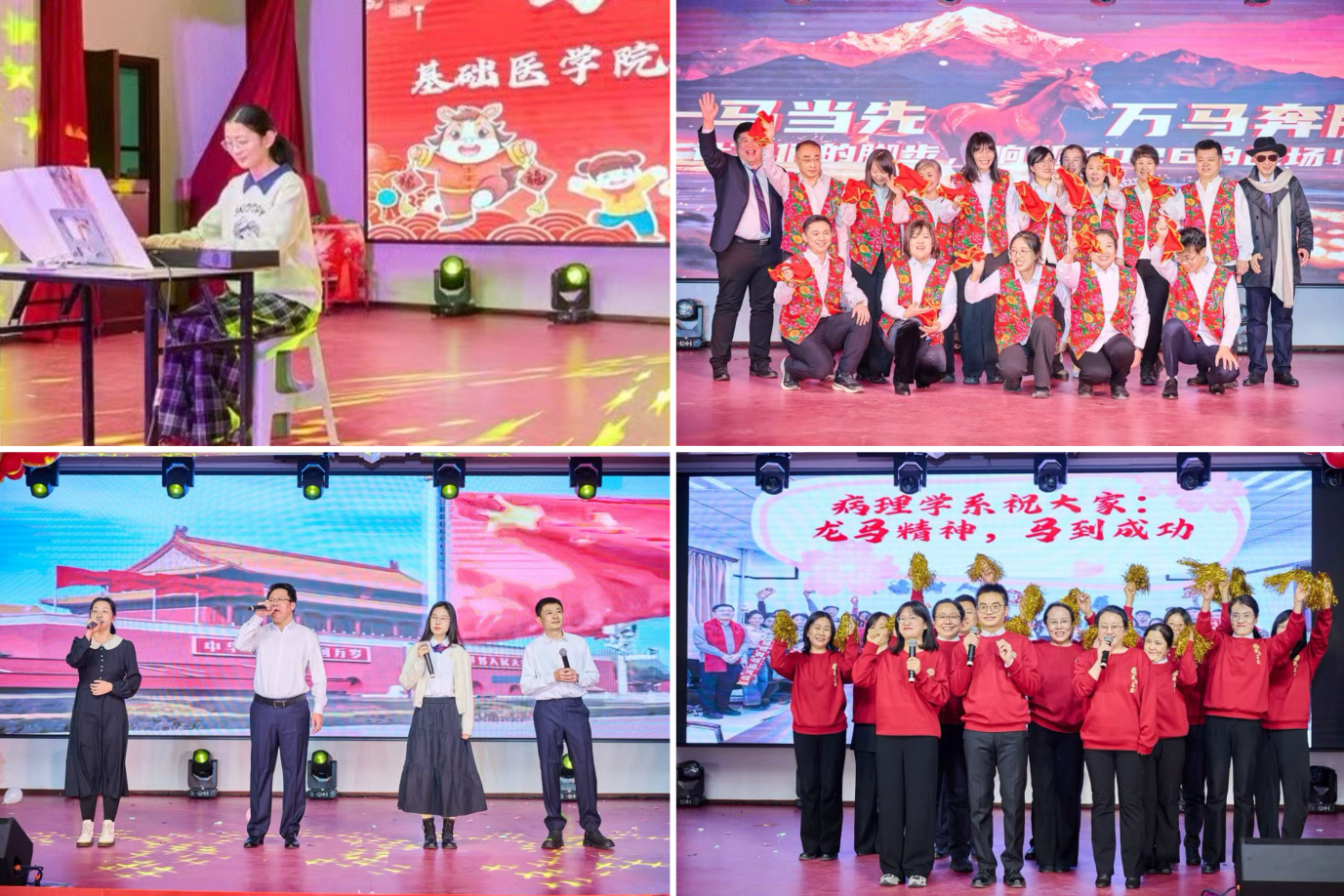 专业演绎与情感共鸣交织,传统文化与时代气息相融。组织学与胚胎学系的杨承锦带来钢琴曲独奏,指尖流淌的旋律辗转悠扬,将心意流转于琴键之间;生物化学学系、分子生物学系、二综合、动物实验中心的老师们联合呈现原创歌舞《浮沉皆过往・基础是归乡》,以深刻立意与动人演绎,诠释了对欧洲杯“根基”的眷恋,传递出踏实温暖的情感力量;李东洋、赵航、吕东芳、颜晓羽四位老师唱响的《我爱你中国》,用滚烫歌声告白祖国,引发全场同心共鸣;病理学系的老师们带来的歌舞《风吹麦浪》,勾勒出诗意田园场景,让观众在悠扬旋律中感受岁月静好;王放院长、孙巍副院长携手演唱的经典歌曲《再回首》,唤起全场对温暖岁月的共同追忆,将现场气氛推向了新的高潮;欧洲杯
