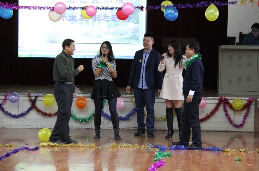 运动会在研究生充满活力的“小苹果”和“兔子舞”中拉开帷幕。比赛共分为四个队,在欢快的音乐声中,院领导带头,老师和研究生积极踊跃上场,第一个比赛项目“跳单、双圈”瞬间将现场气氛推向高潮。紧接着拍球接力、螃蟹背西瓜、摸石过河,心有灵犀,穿衣接力等项目使现场氛围异常活跃。场上师生队员们相互支持、相互鼓励,紧密配合,全力争先,动感十足的音乐更激发了参赛队员奋勇拼搏的斗志。场下观众在教师领队和学生领队的带领下,呐喊助威,掌声、加油声、口号声不绝于耳。期间穿插的游戏“五毛一块”令师生爆笑连连,一首“勇敢”让演唱者演绎得精彩至极,主持人幽默诙谐的话语为比赛也增添了许多亮色。