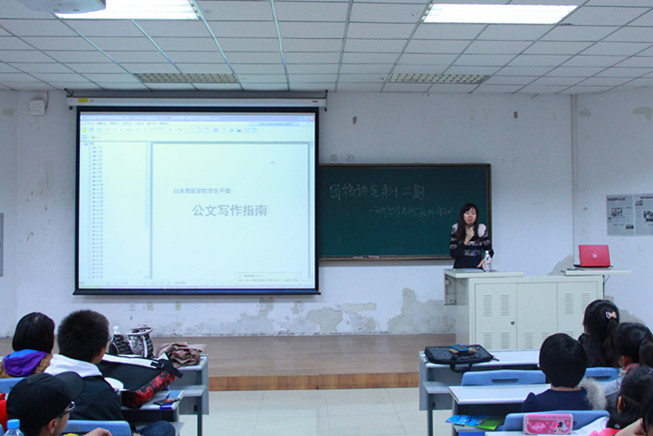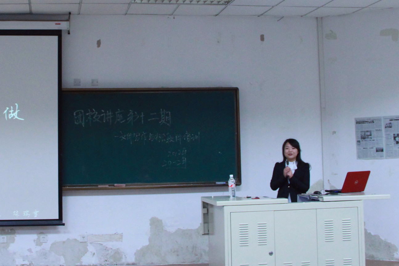 本次讲座的主题为“文件写作培训与办公软件培训”。首先,李梓萌结合自身经验与知识积累,分别从电子文稿的基本要求、写作规范等方面对学生干部公文写作进行指导,并就如何写好通知、计划、总结、规划等多个常用文本进行了详细介绍。随后,陈瑞雪讲授了PPT的制作并进行现场演示,从图片选择、色彩搭配、动画效果制作等方面向大家传授制作方法及技巧。