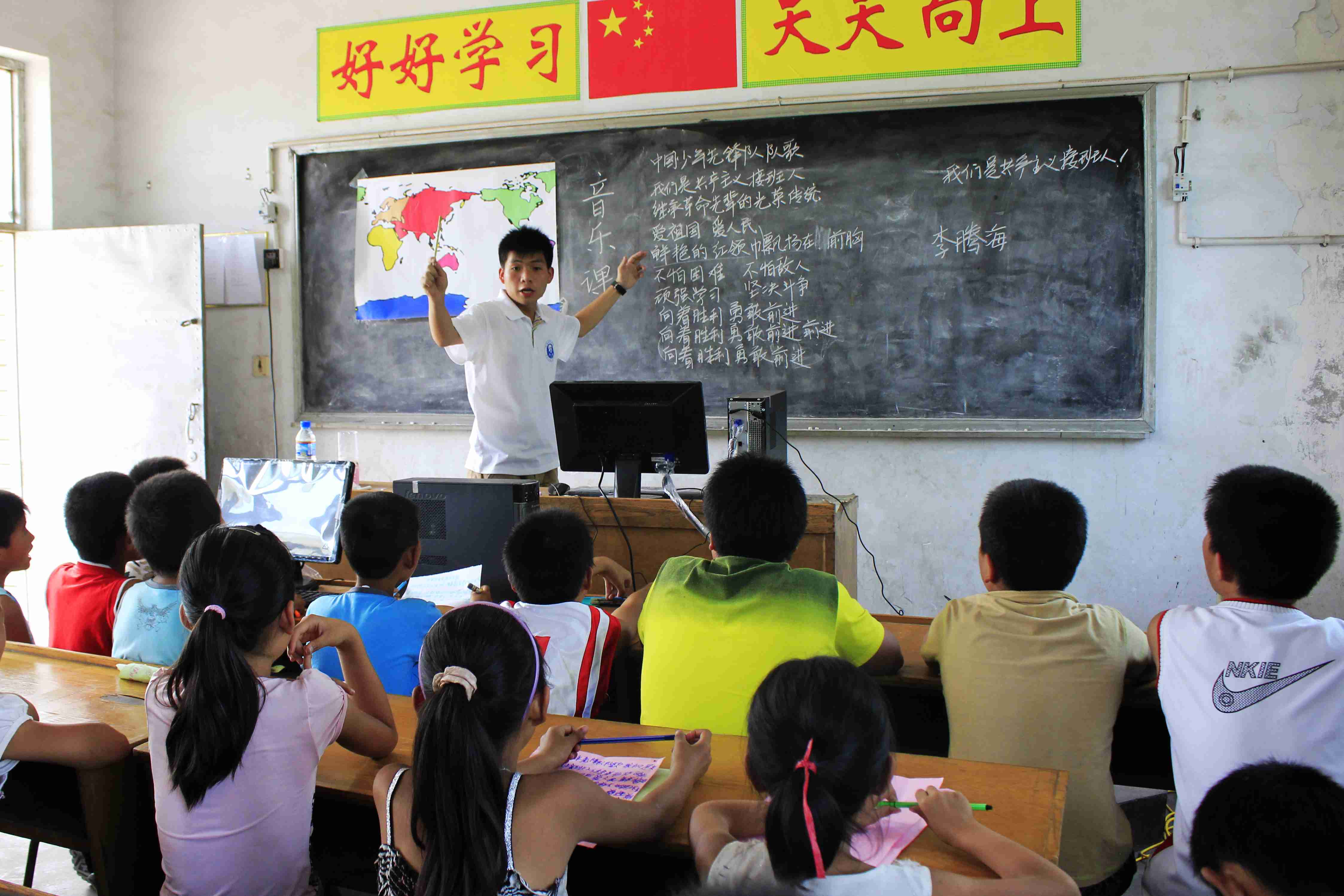 牛眼沟村位于大山深处,信息闭塞,生活艰苦,这里的孩子们的教育资源更是有限,社会实践小分队不仅带来了电脑,打印机,书籍,更带给了孩子们山外面的精彩世界。经过事先精心的安排和准备,社会实践小分队每天都给孩子们上课,不仅教给他们必需的文化课,还教给他们丰富多彩、具有教育意义的学习内容。梦想课上,孩子们畅谈自己的梦想;音乐活动课上,孩子们又唱又跳,他们的笑脸和歌声都深深地印在了队员们的脑海之中;电脑课上,孩子们围坐在电脑旁惊叹于每一项操作并好奇地盯着电脑上的每一个图标;事故逃生讲解课上,孩子们互帮互助,在演练中团结一致,确保了每一个同学都安全地撤出。每一节课,孩子们都能带给队员们感动与幸福,而每一节课,队员们也带给了孩子走出去的希望和信心。