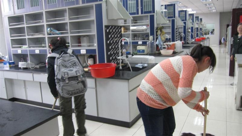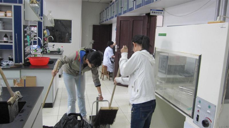 生物化学是701001班本学期医学基础课的主干课程。全体同学与生物化学教研室的老师们建立了良好的师生情谊。值此“尊师重道”活动开展之际,在征得教研室的老师们同意后,701001团支部的20余名团员来到了白求恩医欧洲杯基础楼二楼生物化学教研室,为实验室义务清洗实验器材,规整实验室杂物,清理地面,擦洗玻璃。在全体同学的共同努力下,整个生物化学实验室焕然一新。