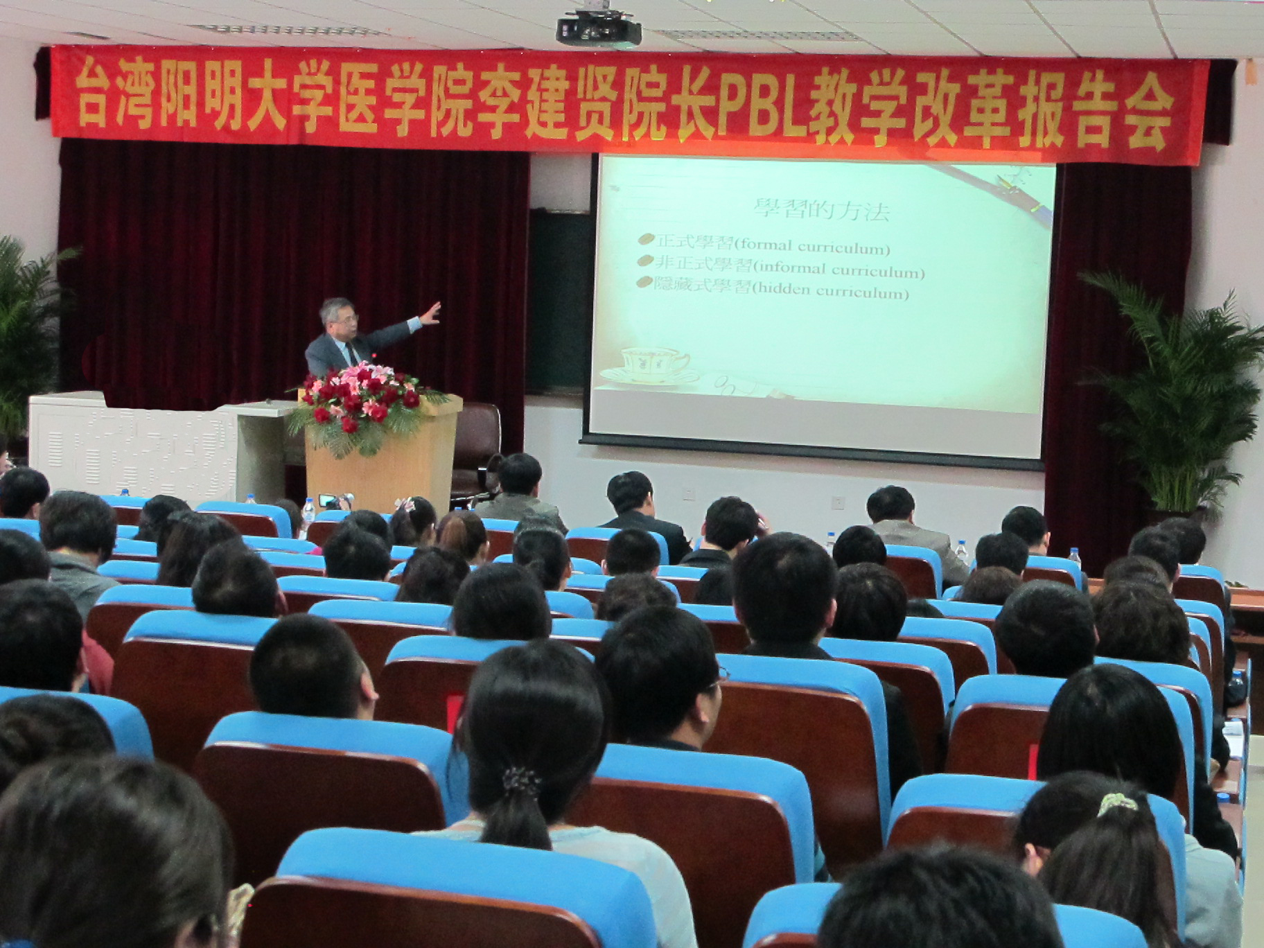 4月13日下午,王冠军主持教学改革报告会并致辞。他全面分析了我校医学教育现状以及所面临医学教育改革的重要性和紧迫性,提出借鉴国内外医学教育成功经验,转变教学观念、理念,改变医学教育模式,全面深化医学教育改革。李建贤详细回顾了阳明大学10年来开展PBL教学改革的曲折历程与教改经验,阐明了新时代学习的核心观念。他从“成人学习的六大特色”“大学教育的挑战”“新时代学习的核心观念”等方面阐述了阳明大学尝试的各种教学方式与学习效果,并现场互动,与师生一起深入探讨医学教学模式。