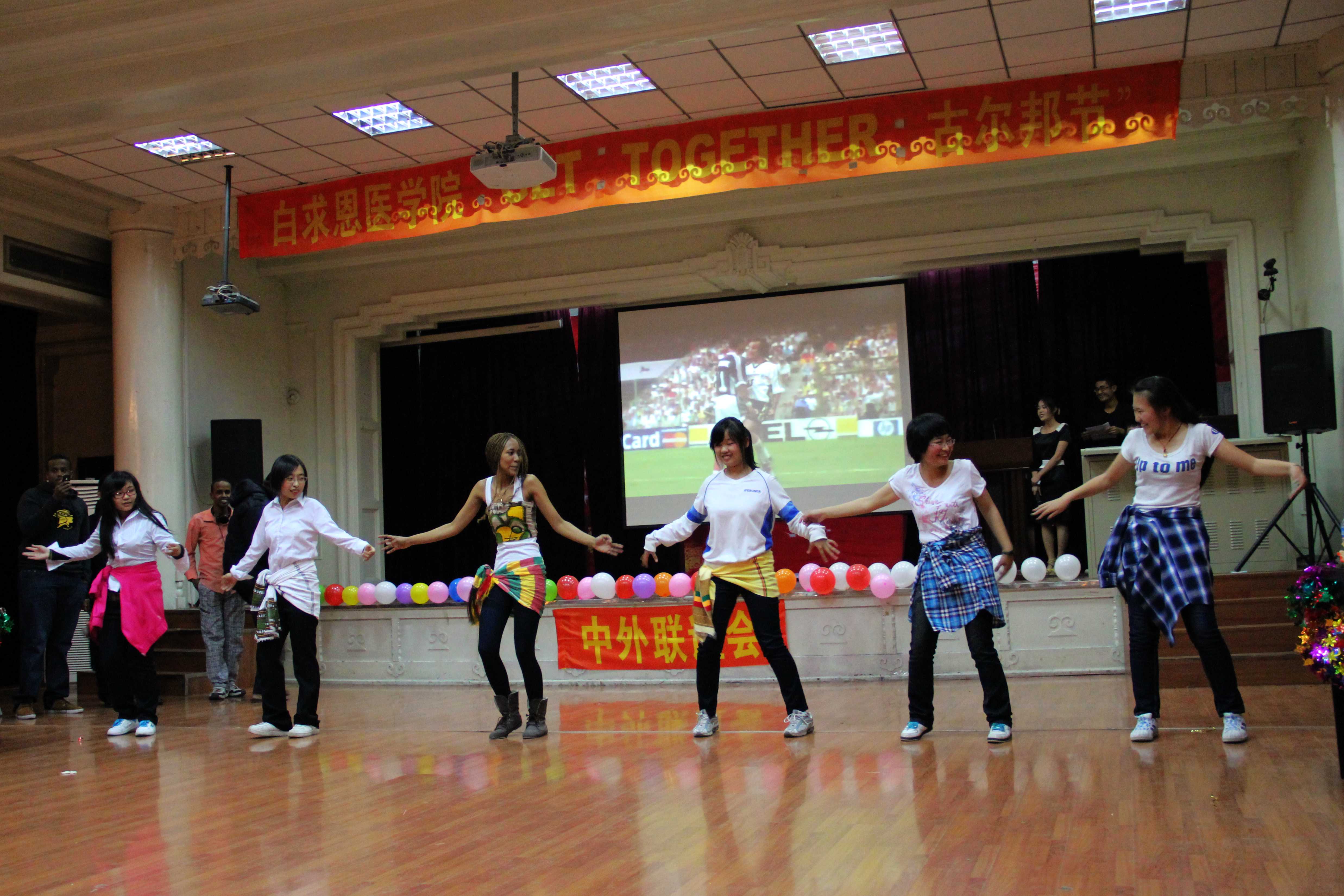 此次联谊会的气氛热烈,中外学生一起做游戏,加强了彼此之间的交流;游戏结束后,同学们纷纷表演自己的节目:精彩的维族舞蹈、激情澎湃的交际舞、热情洋溢的非洲舞,把晚会一次次的推向高潮;乌兰克女孩的太极扇表演更是让大家叹为观止。