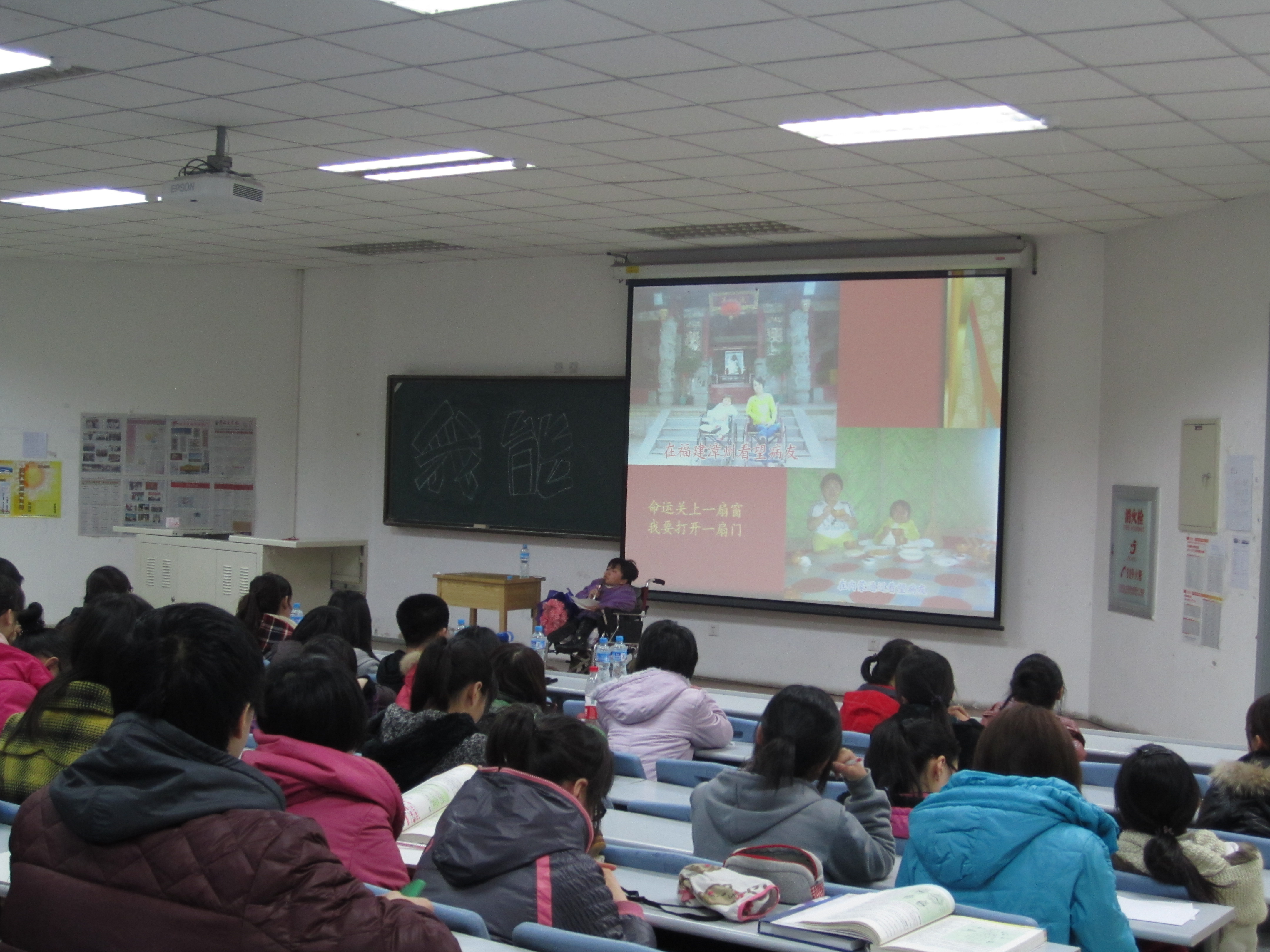 本期讲座的主讲人为于海波女士,她和同学们分享了她艰难而又不平凡的曲折人生。于海波女士由于患有先天性脆骨症,从小只能依靠轮椅生活。然而,病魔无情的折磨、他人异样的眼光并没有使她丧失生活的信心。她从小自学书本,参加成人自考,积极投身公益。1995年,于海波女士带领大学生志愿者开通“心语热线”,为大家提供了一个倾诉烦恼的平台;1996年10月“心语协会”正式成立,本着“拥有爱是幸福,给予爱是快乐”的宗旨,始终坚持帮助家庭贫困的中小学生,完成孩子们学习的梦想。