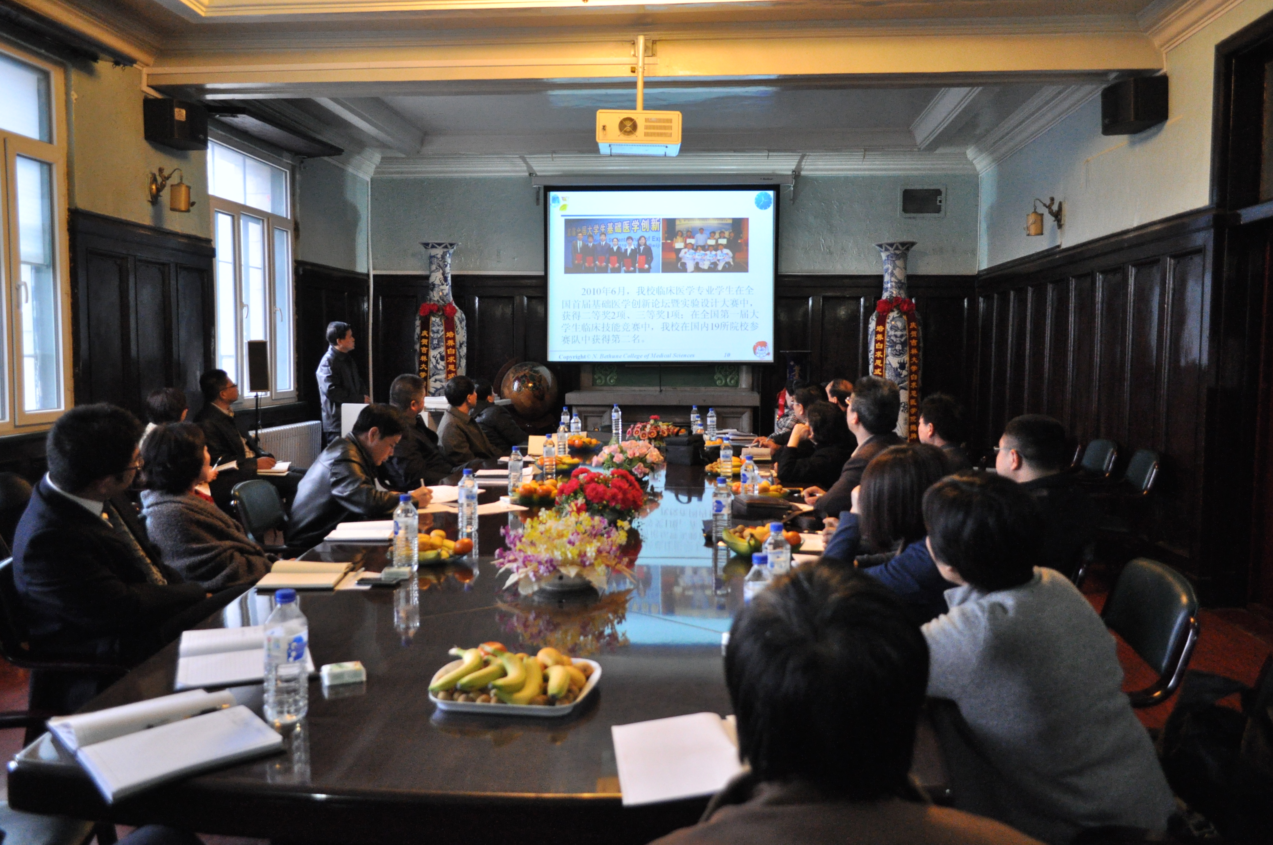 医务处处长高占东就学校医务处的工作职能和范畴以及运行机制等情况向与会人员做了介绍。之后,与会人员就两部共建举措、医学管理体制和后勤管理模式等进行了深入的交流和讨论。