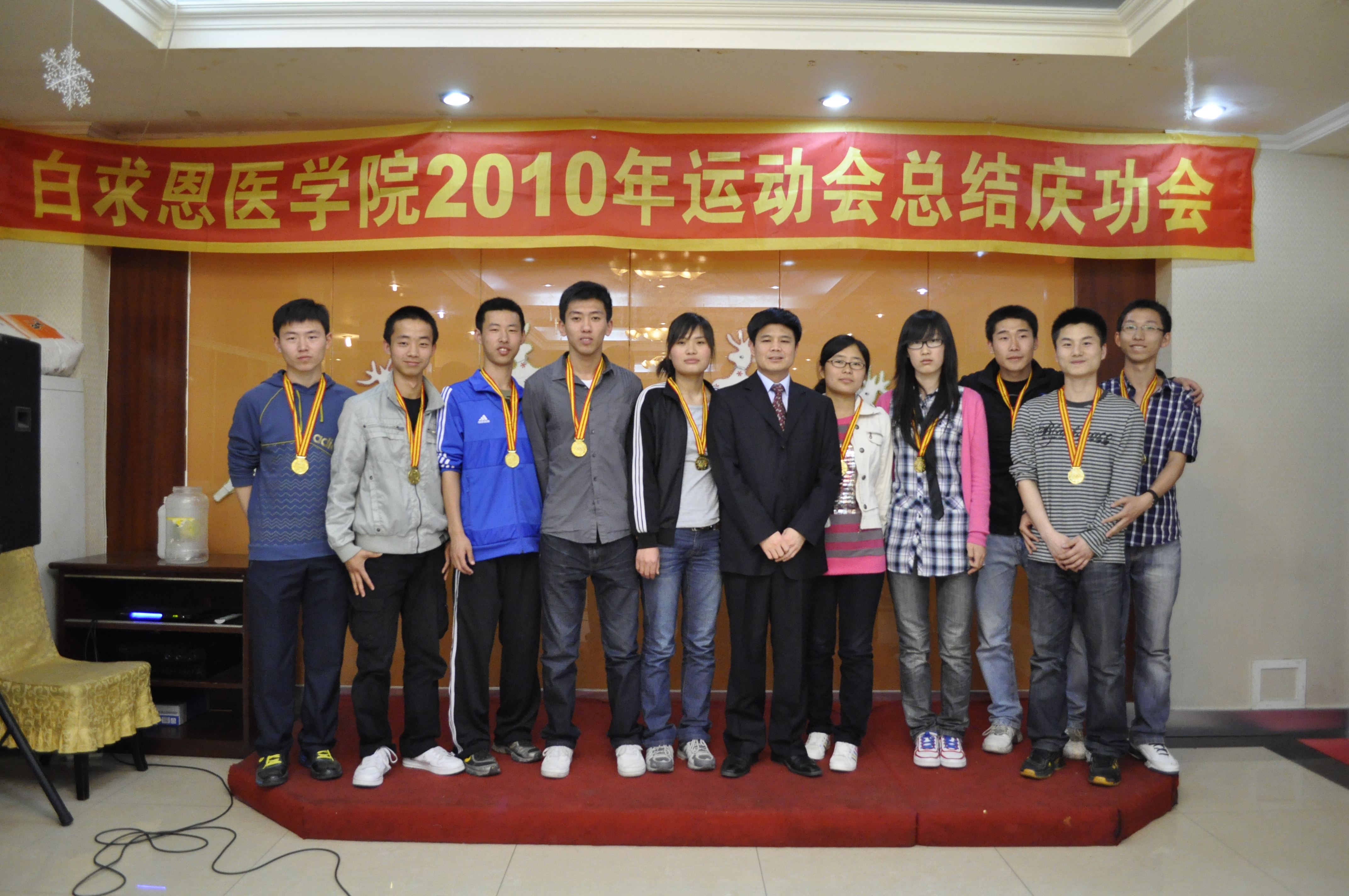 5月14日晚,白求恩医欧洲杯2010年运动会总结庆功会在西中华宾馆举行,欧洲杯党委书记屈英和、党委副书记兼副院长苑锐以及欧洲杯全体运动员、工作人员参加了总结庆功会。会上,党委书记屈英和为获得五四接力长跑冠军的十名运动员颁发金牌,党委副书记苑锐为在运动会各项比赛中获得前八名的运动员颁发证书。