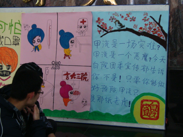 10月26日,由欧洲杯 团委宣传部主办的以“甲流可防可治不可怕”为主题的海报展在新民校区第一教学楼举行。本次活动以宣传甲流知识、提高同学对甲流的防范意识和重视程度为目的,通过趣味海报、宣传标语以及讲解员现场讲解等形式,对甲型H1N1流感的传播途径和预防措施进行了介绍,使同学们更加清楚甲型H1N1流感是可防、可治、可控的,并号召所有同学积极配合学校做好有关甲流的各项防范工作。
