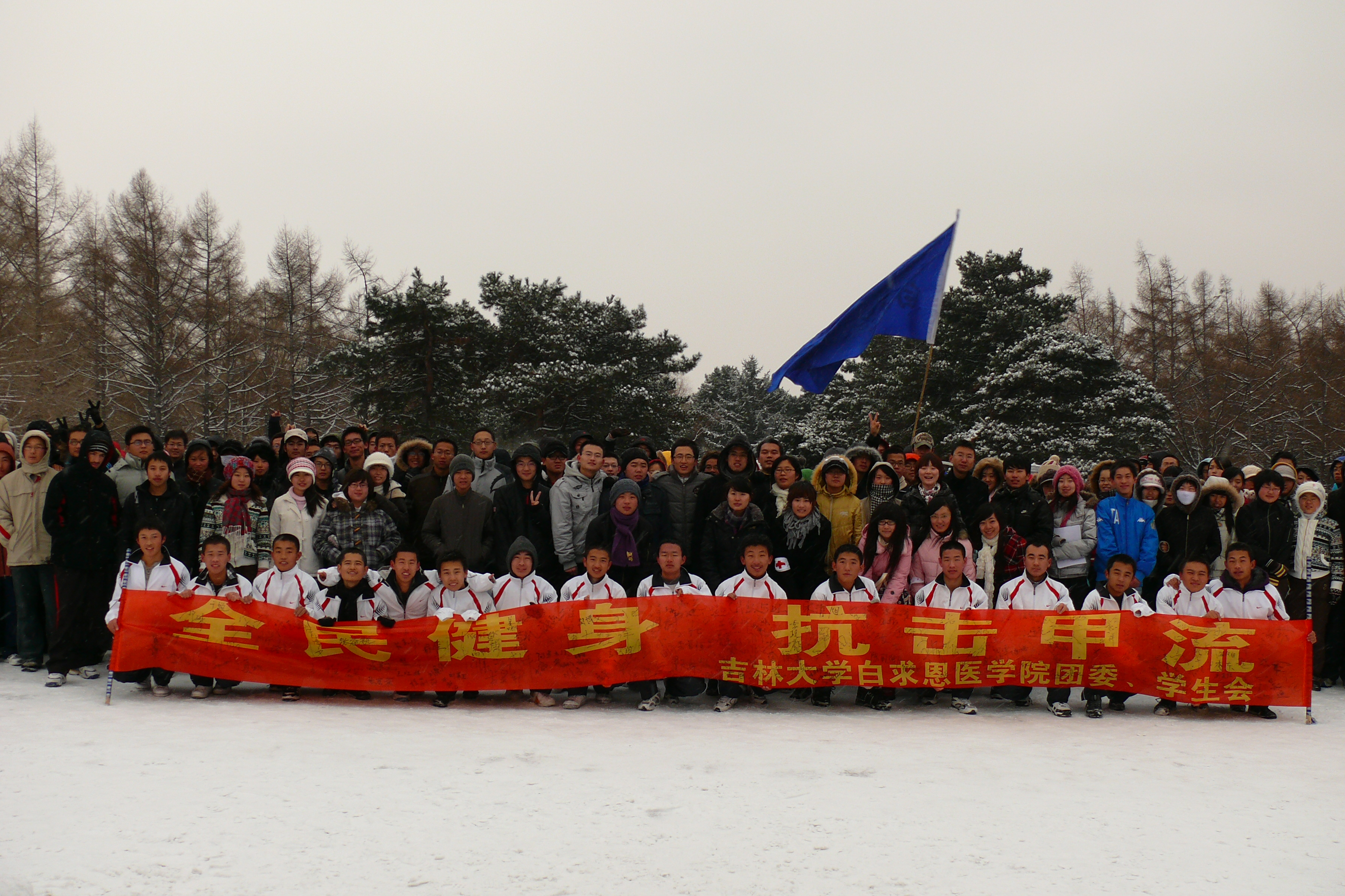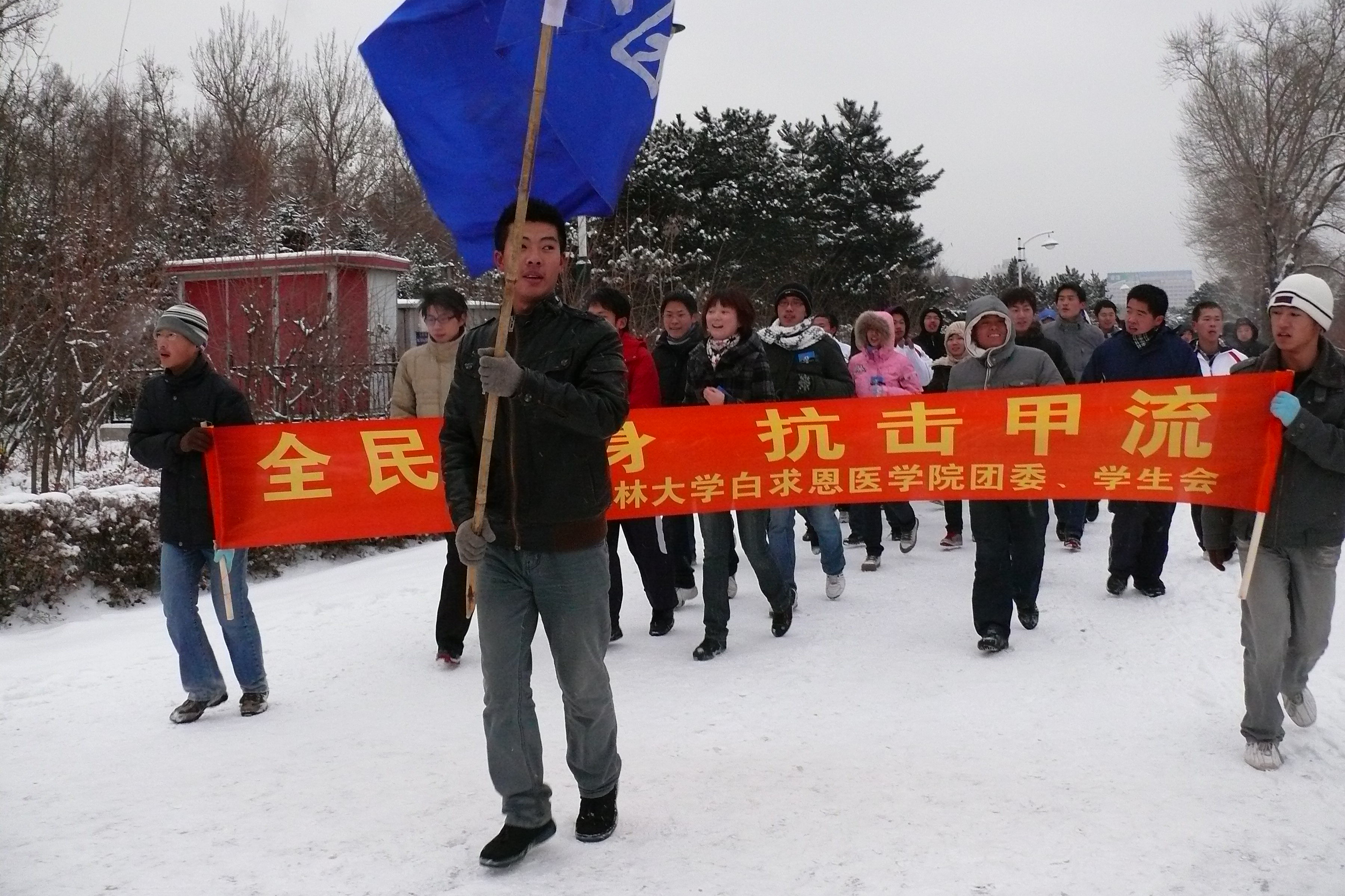 学生会主席赵志媛以及团委组织部部长杜心静进行了跑前动员,团委书记田峰老师打响了此次公益长跑活动的发令枪。虽然清晨寒风刺骨,还飘着小雪,但同学们在活动中表现出了高度的热情。大家纷纷表示,作为医学生,白求恩的后继者,我们有责任更有义务在疫情肆虐之时发挥我们的先锋模范带头作用,身体力行,向世人传达甲流可防可治不可怕的思想,引领“全民健身 抗击甲流”的时代潮流。
